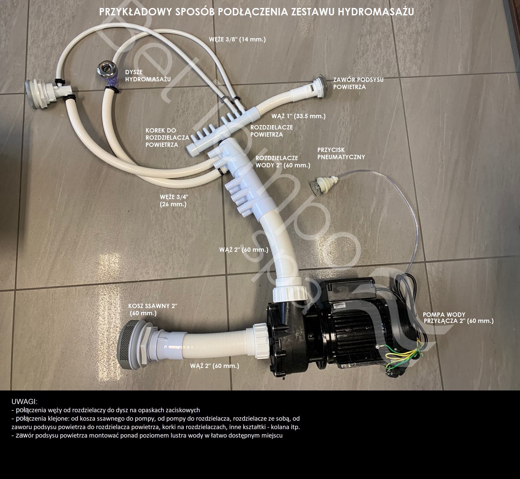 Konieczne jest wyprowadzenie wężyków podsysu powietrza od dysz ponad poziom lustra wody w wannie/balii. Można skolektorować je w rozdzielacz i podłączyć do zaworu regulacji powietrza.