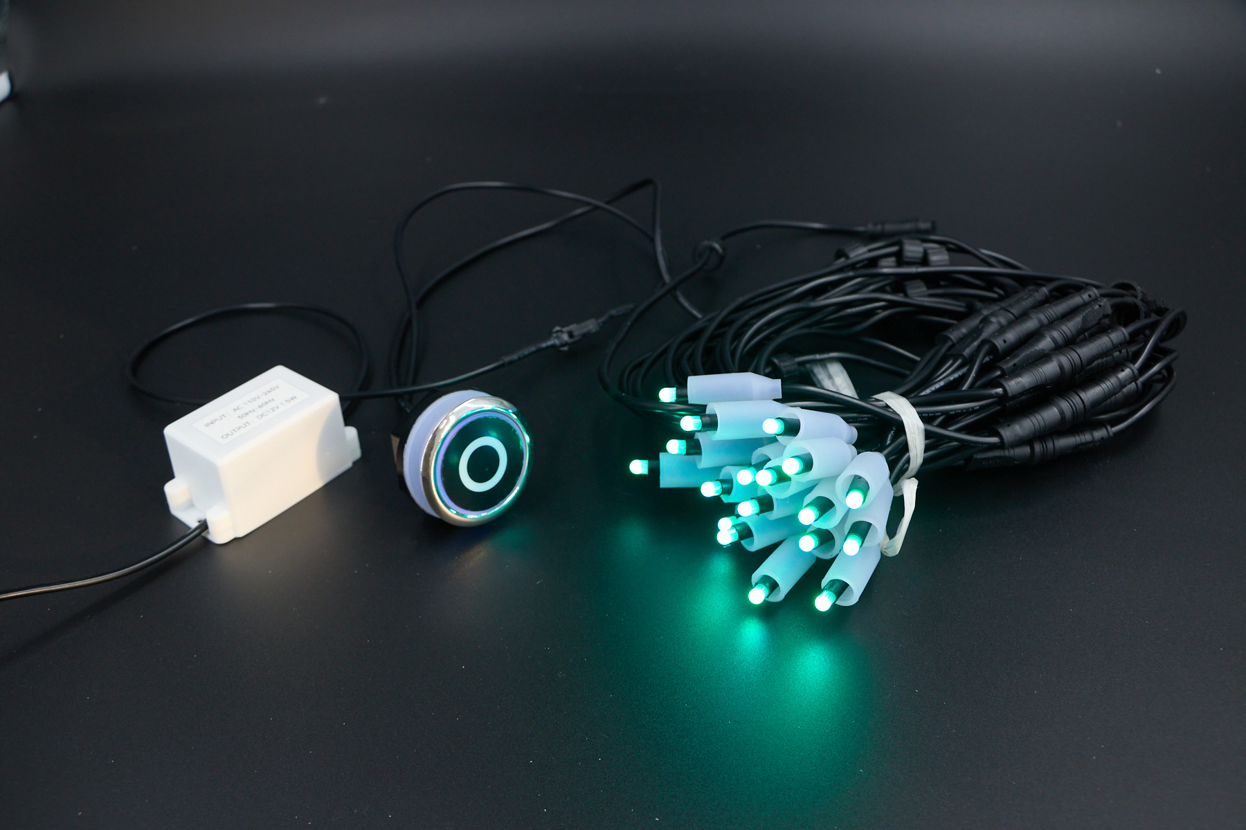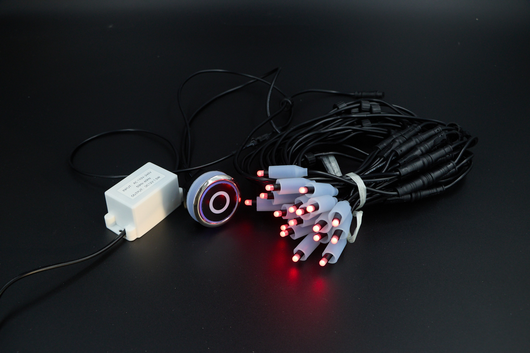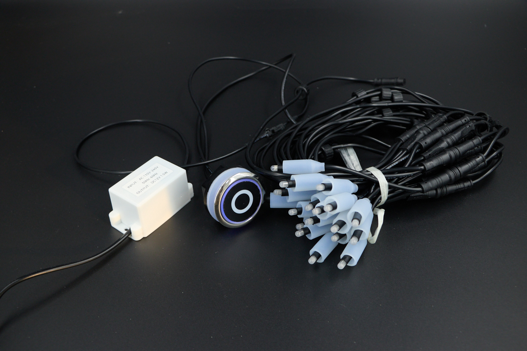 W komplecie: zasilacz, okablowanie, przycisk dotykowy podświetlany, soczewka z diodami – 14 szt.