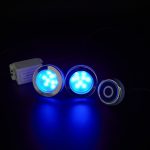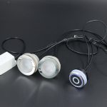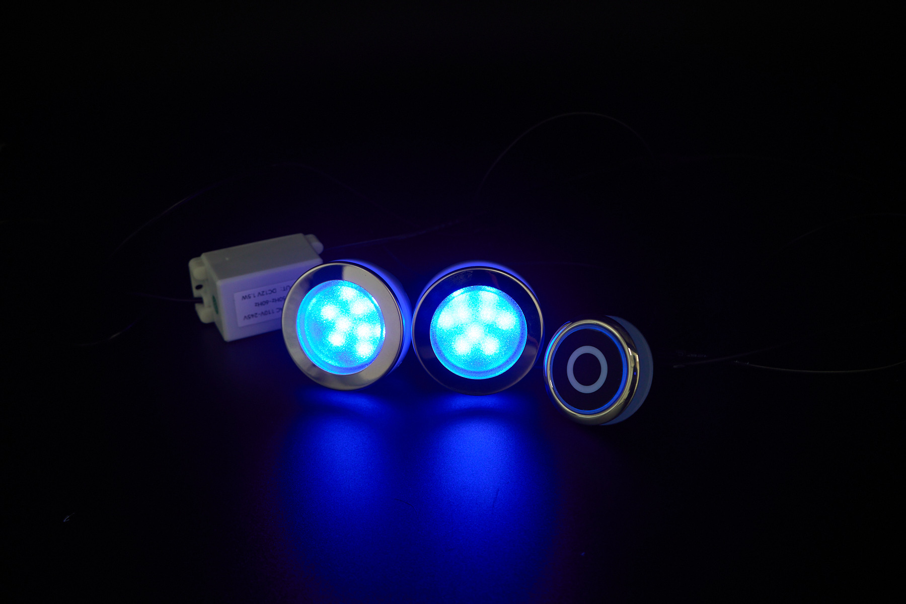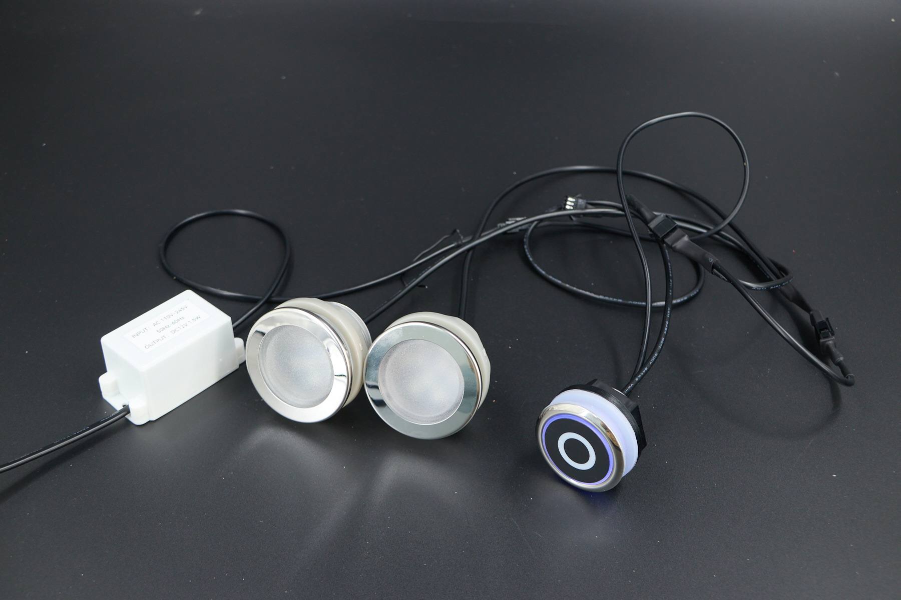 Soczewki przeznaczone do podwodnego montażu w komplecie z diodami  oświetleniowymi LED RGB, przyciskiem dotykowym podświetlanym do montażu na wannie Spa/balii, zasilaczem.