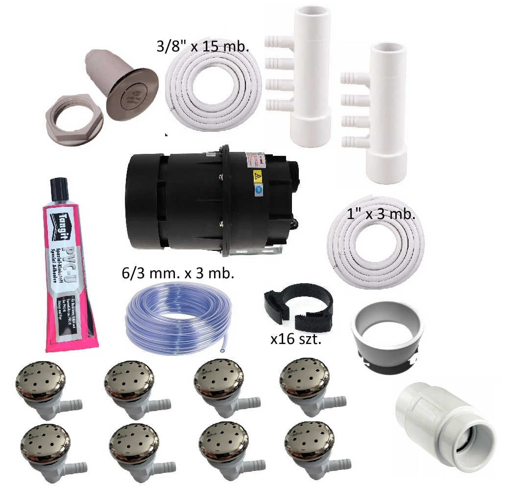 Kompletny zestaw masażu powietrznego z dmuchawą i wszystkimi potrzebnymi komponentami do montażu jak i użytkowania w wannach Spa/jacuzzi/baliach/mauzerach/basenach.